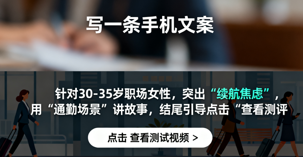 ✅ 高手之思:“针对30-35岁职场女性,突出『续航焦虑』,用『通勤场景』讲故事,结尾引导点击『查看测试视频』。” — 目标、对象、方法、转化,一清二楚。