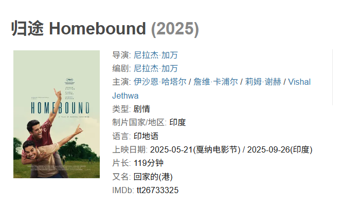 Neeraj Ghaywan 的《Homebound》 的核心是一个年轻人背着另一个年轻人的形象。影片开头,我们看到背负的画面充满了欢笑和喜悦。到了影片结尾,它变成了一次对抗死亡的绝望尝试。